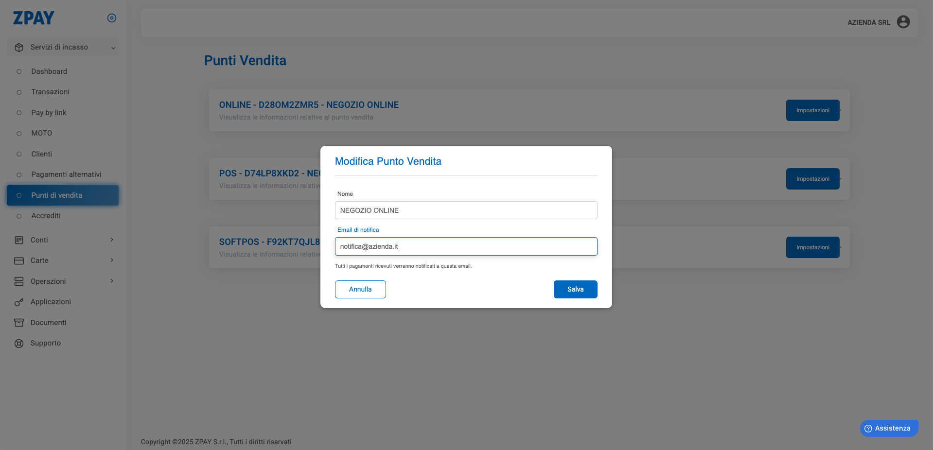 - Inserisci nel campo “Email di notifica” l’indirizzo email che desideri utilizzare per ricevere gli avvisi di pagamento incassato.