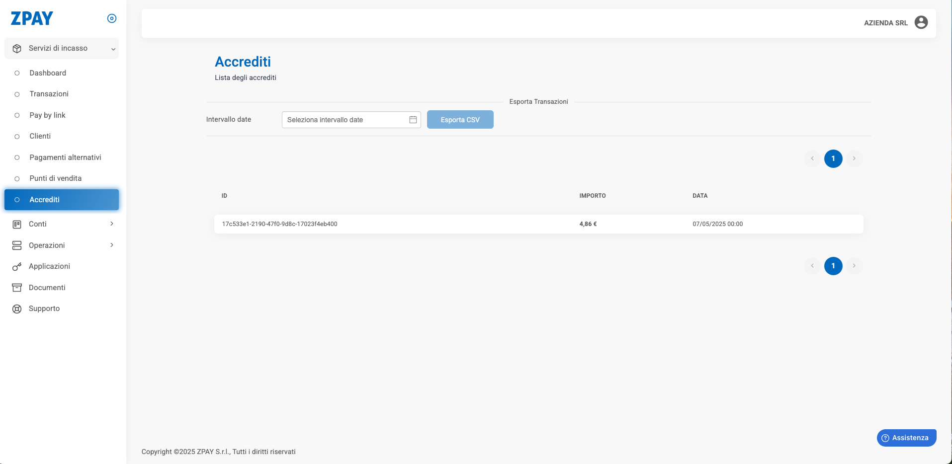 - Si aprirà l’elenco di tutti i tuoi accrediti, uno per ogni bonifico ricevuto da ZPAY.