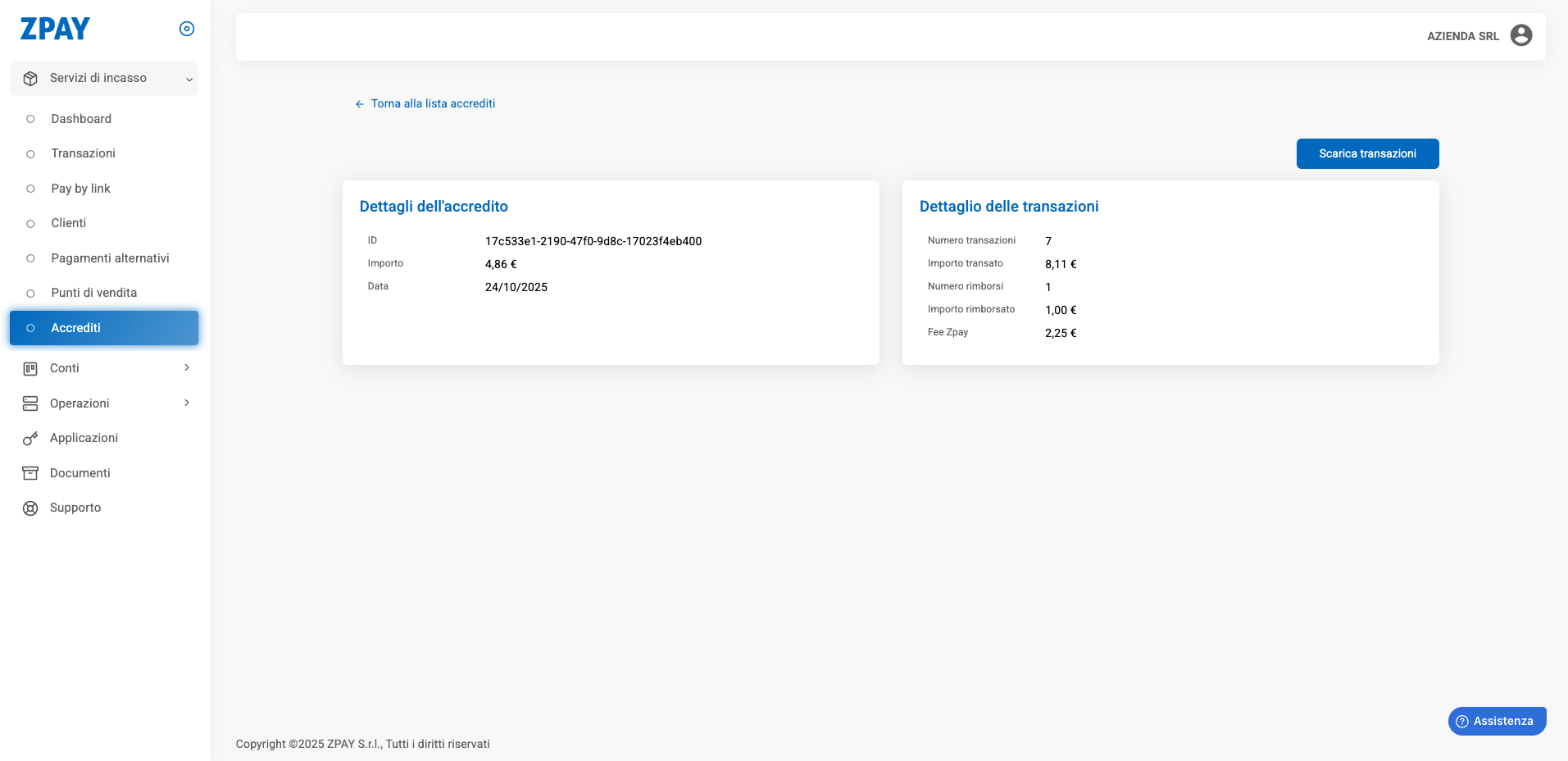 Gli accrediti ti permettono di vedere tutti i bonifici (payout) effettuati da ZPAY e le transazioni incluse in ciascun pagamento.