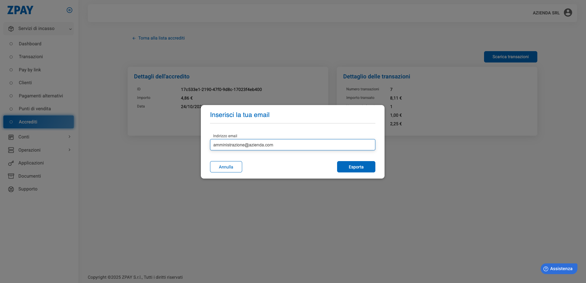 - All’interno troverai il pulsante “Scarica Transazioni”: selezionalo per ricevere via email il file CSV con il dettaglio di tutte le transazioni incluse. Ti sarà richiesto di inserire l'email dove ricevere l'export delle transazioni.