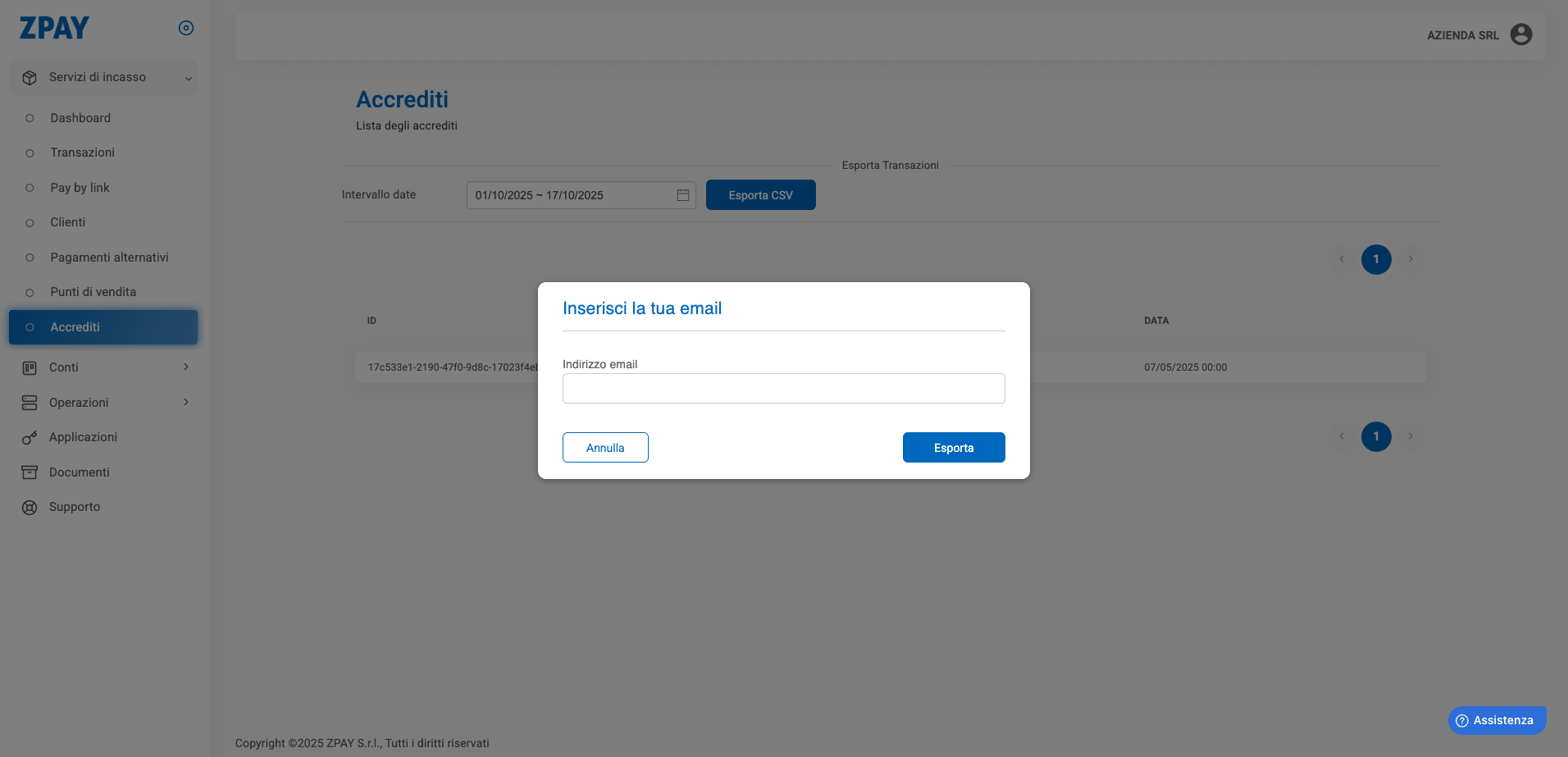 Suggerimento: nella pagina principale puoi anche filtrare per periodo, per visualizzare o scaricare più accrediti insieme.